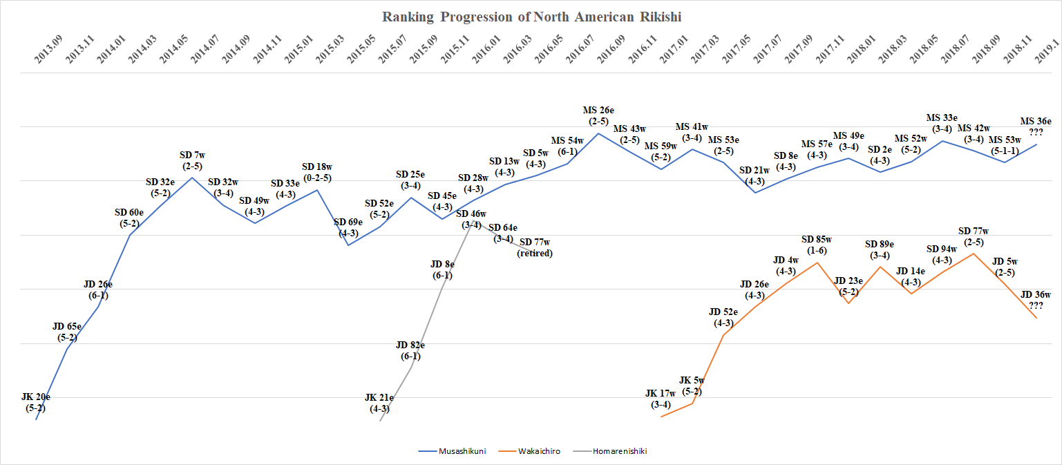 Musashikuni Mamu had his strongest performance in two years. In the Nagoya Basho 2016, he went 6-1 from the makushita 54 rank. In the Kyūshū Basho 2018, he went 5-1-1 from the makushita 53 rank. Déjà vu! On the other hand, Wakaichirō Ken had a disappointing performance, going 2-5 from the jonidan 5 rank. Below is a chart of the career rankings of each rikishi (along with Brodi Henderson), which demonstrates their current momentum. Click here to open a new tab with a full-size version of the chart, which will be used below to predict their performance in the Hatsu Basho 2019.