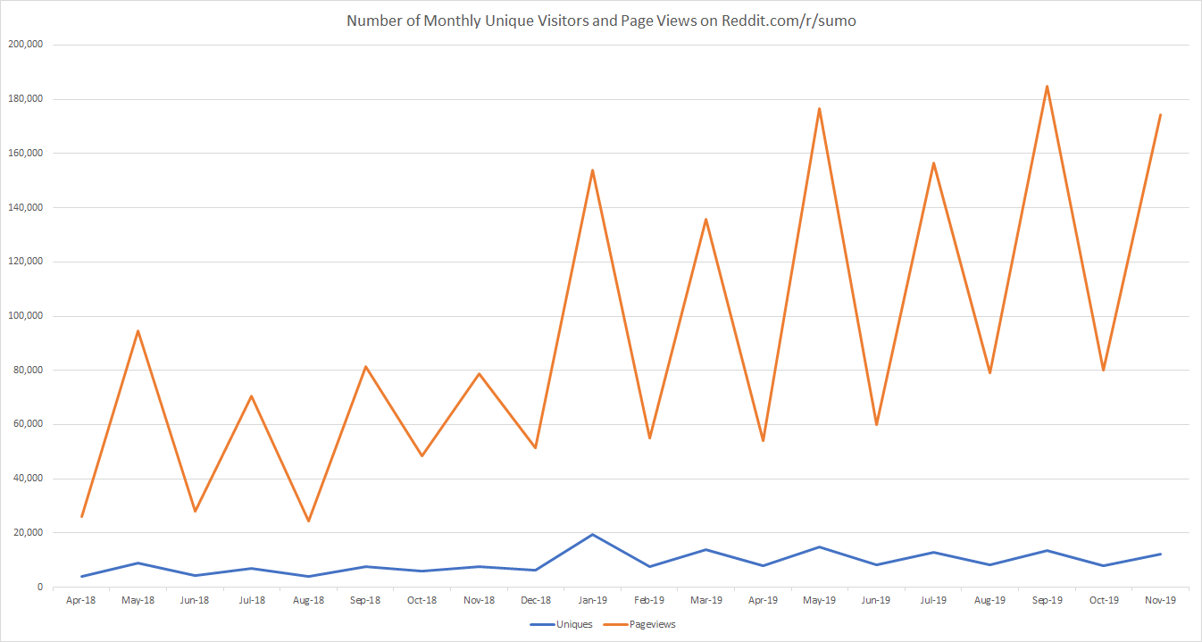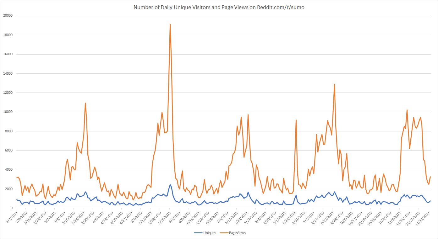 Since Reddit.com/r/sumo started including daily threads for basho, the number of visitors has remained fairly constant; however, the number of pageviews has continued to grow. I guess this means that the subreddit isn’t becoming more popular, per se, but instead that users are getting more into the sport. Also, it is interesting to see that the most recent basho had the most consistent number of pageviews and unique visitors of any basho (and it was relatively high), but there didn’t seem to be a climax day like most basho. I guess this is because everyone thought Hakuho was going to win since day 6 or 7, and it became uneventful. Lastly, one of the largest predictors of pageviews and unique visitors is still whether Tochinoshin is healthy and competing. Hopefully he will be back sooner rather than later in 2020.