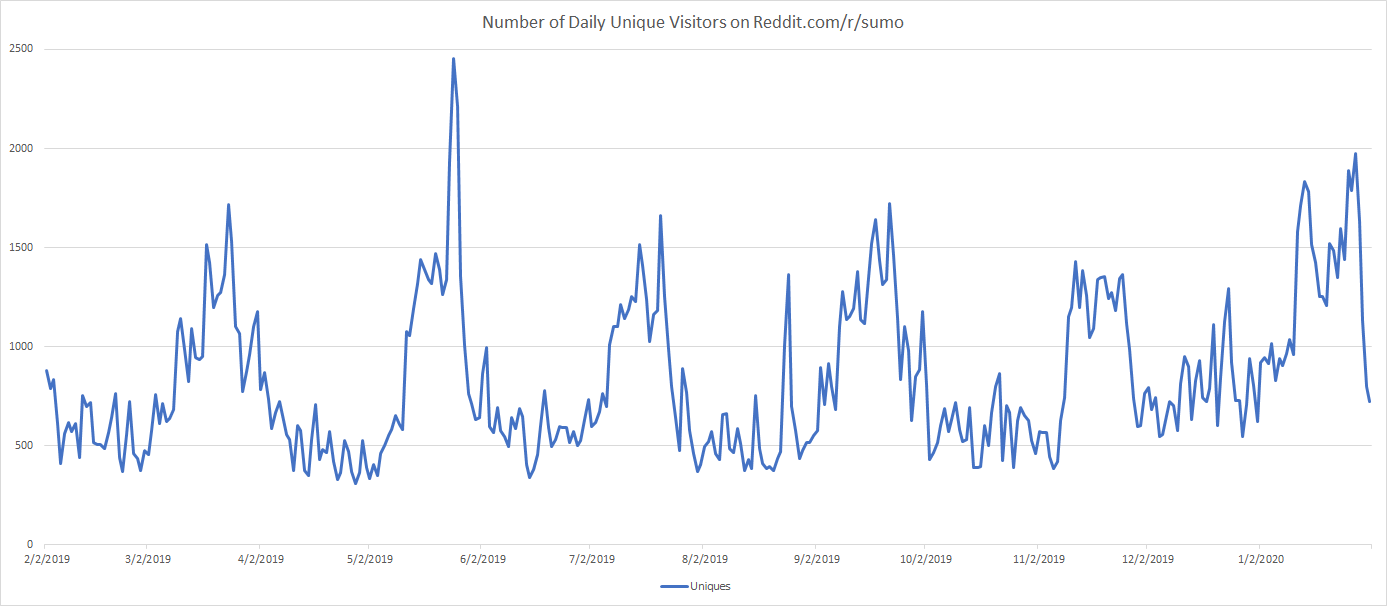 Every basho, I recorded the traffic of Reddit.com/r/sumo in number of unique visitors and pageviews. I wasn’t sure what to expect for this basho, but. . .wow! It was an all-time high for monthly pageviews! I think it was partially because a Reddit.com user posted a video complication of Enho to a larger subreddit on Day 1 of the Hatsu Basho 2020, but it does seem that many of those new users stuck around for the whole basho. Neat!